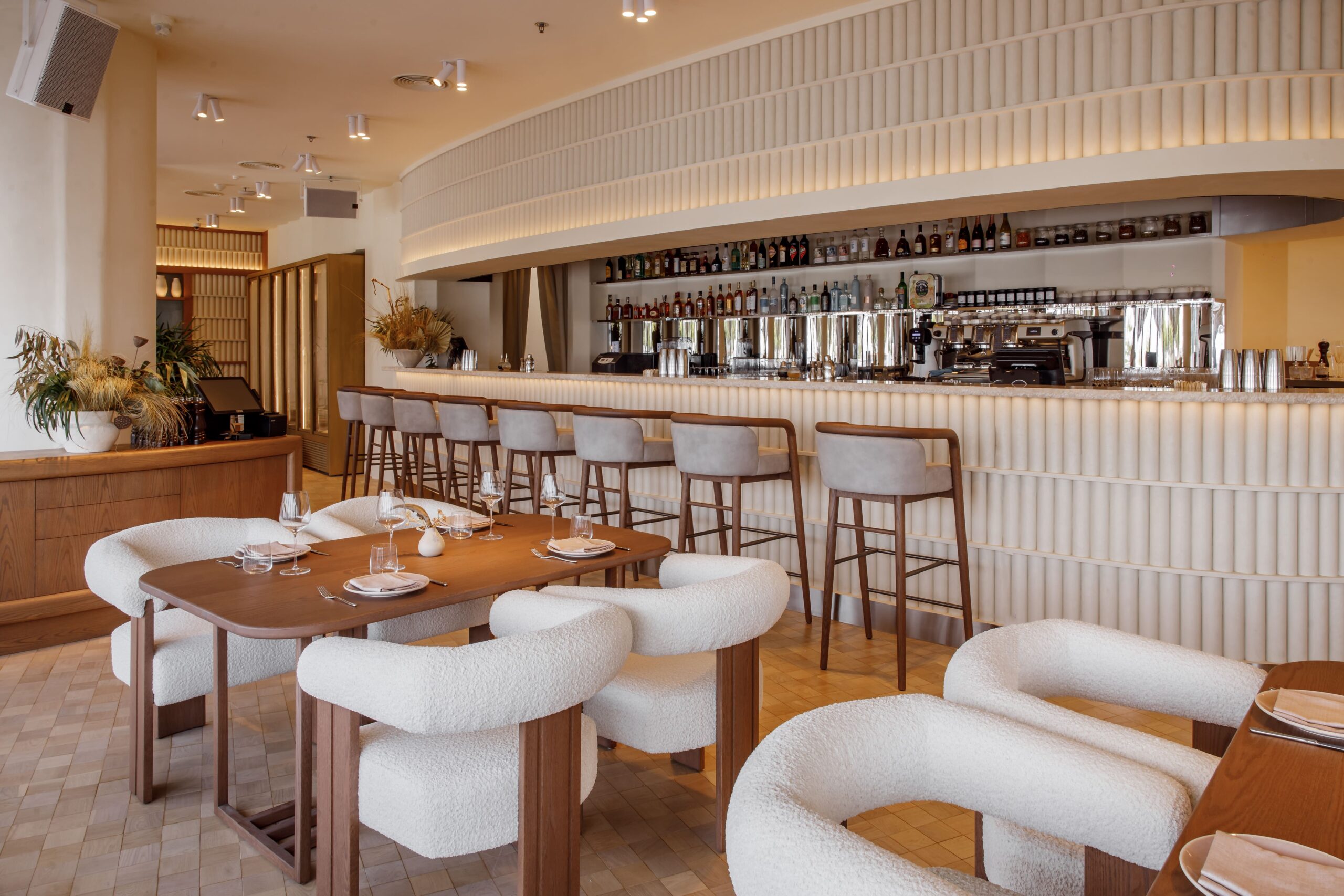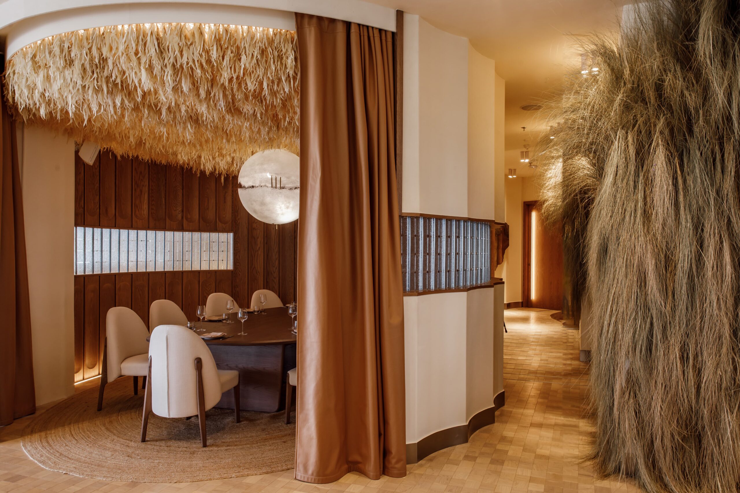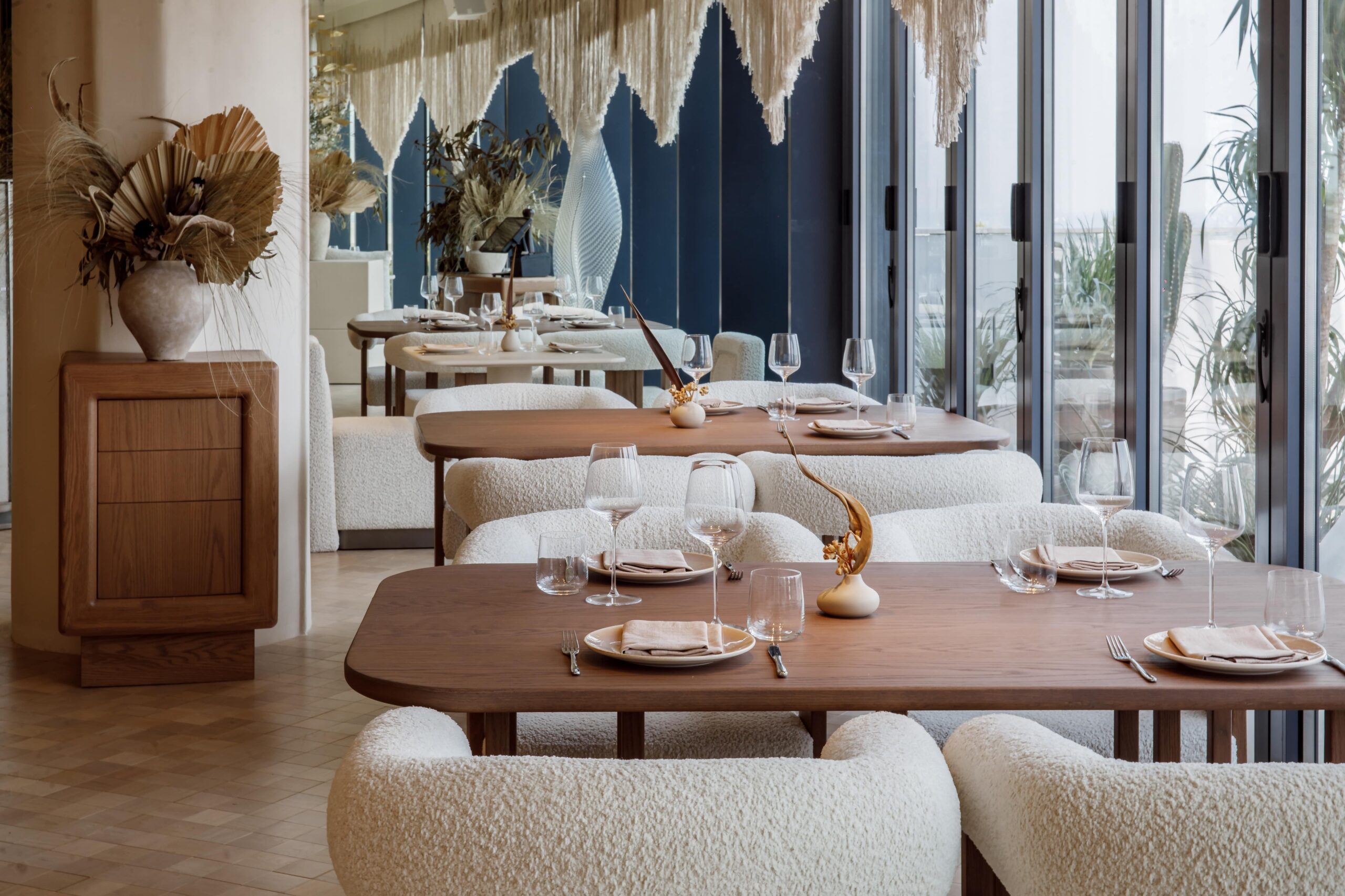 The final result is a refined cultural hub that greets guests with an open-concept kitchen and a warm yet minimalist dining room where sandy colors, an abundance of wood accents, and hand-crafted free-form lights foster a tone that’s relaxed yet upscale.