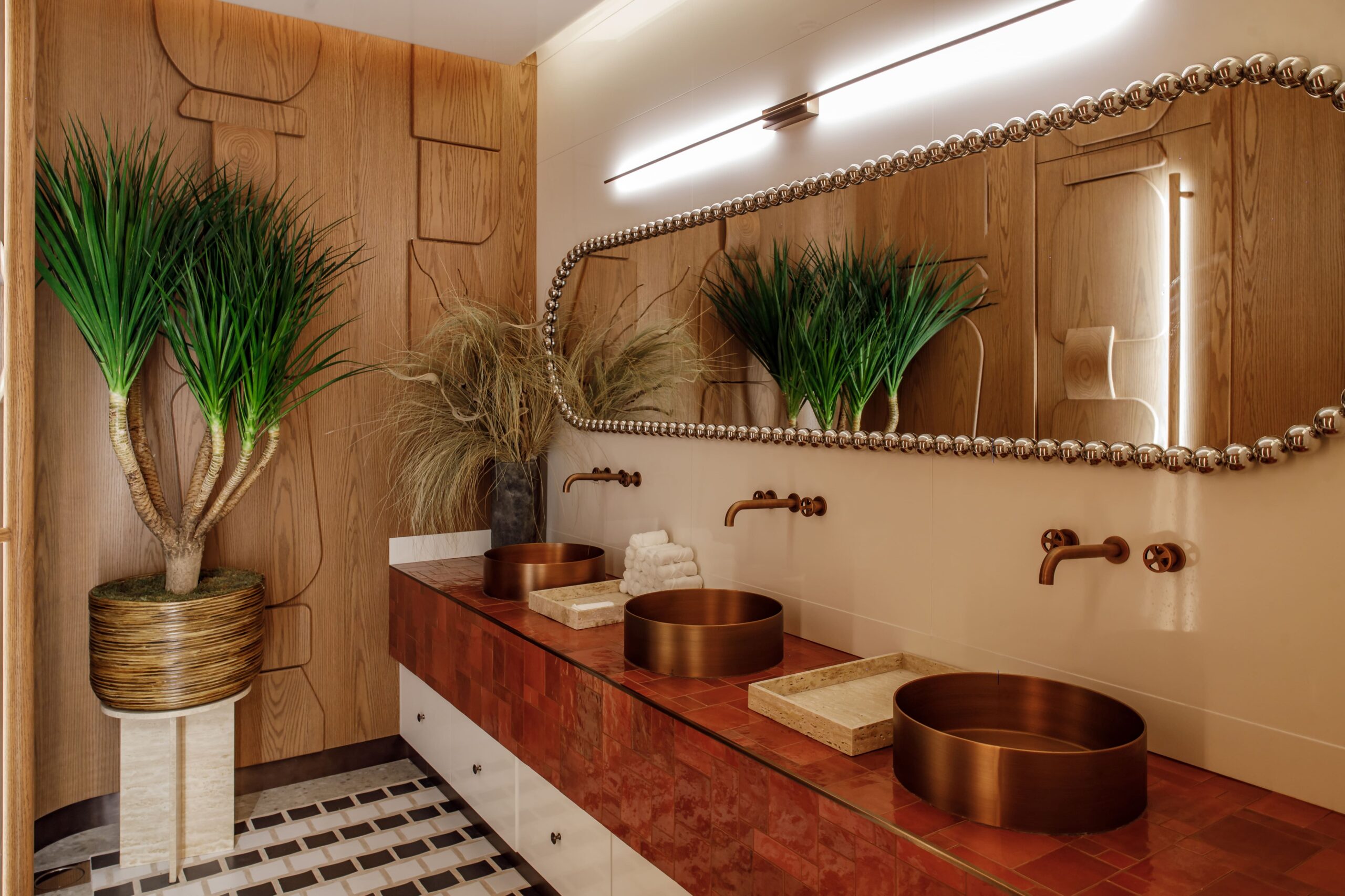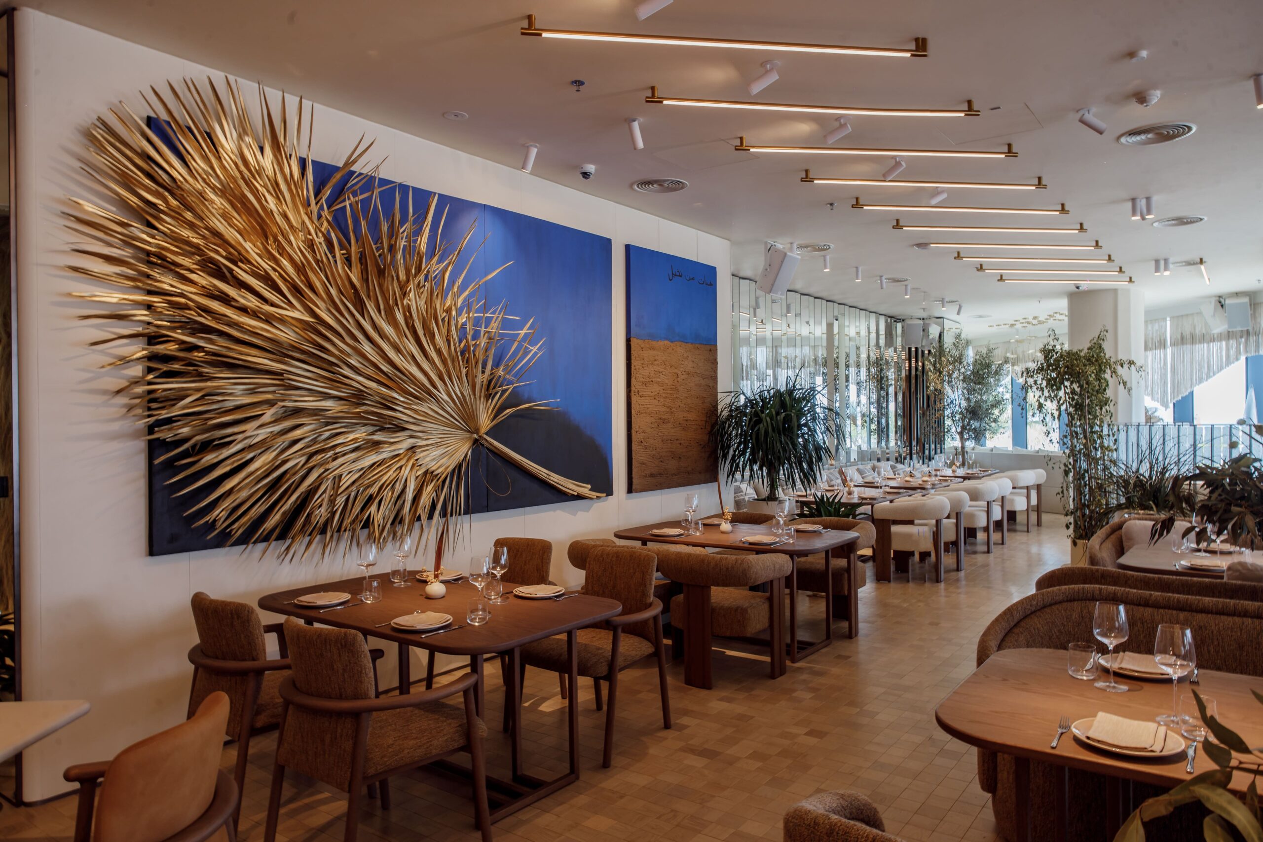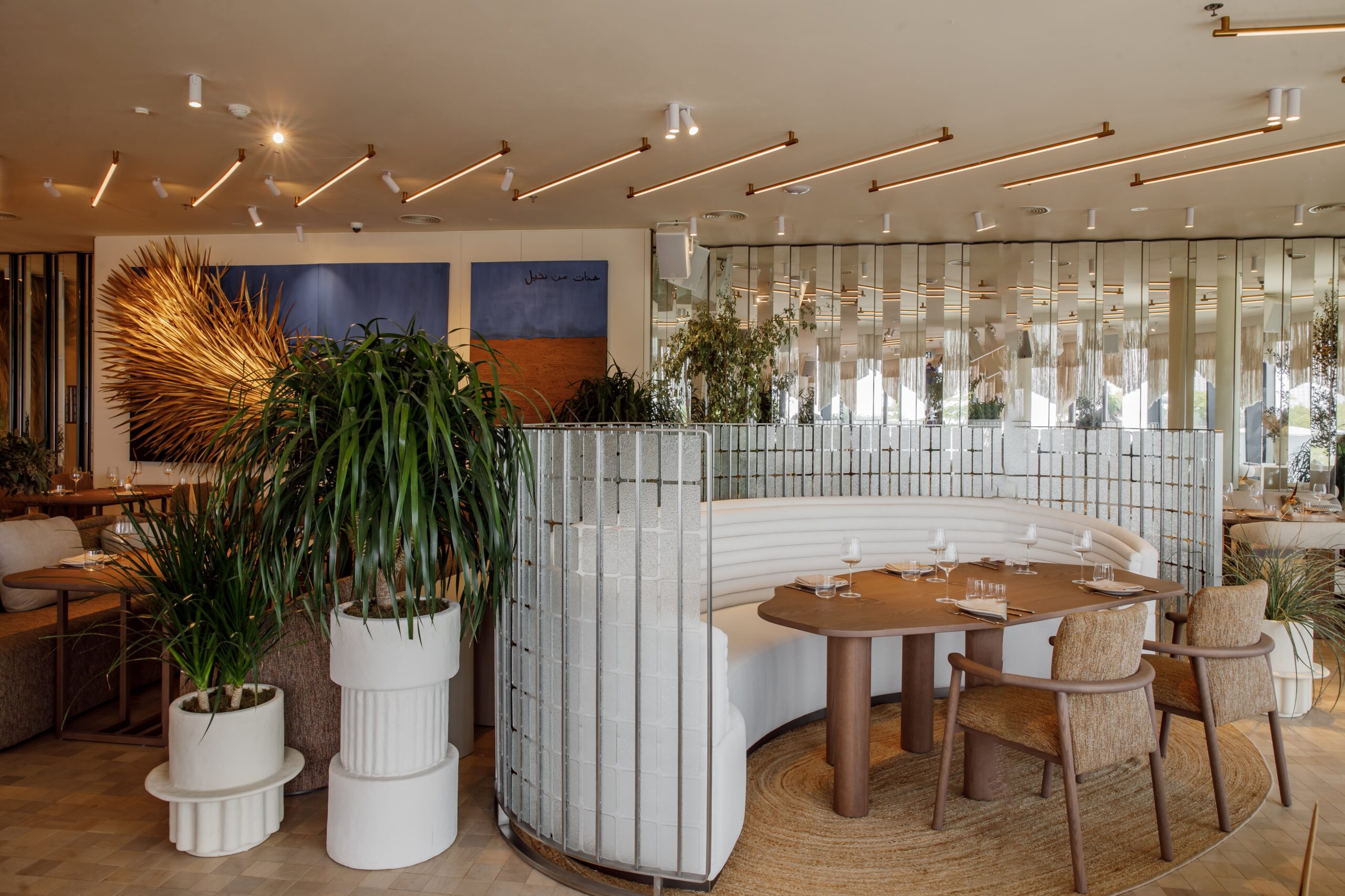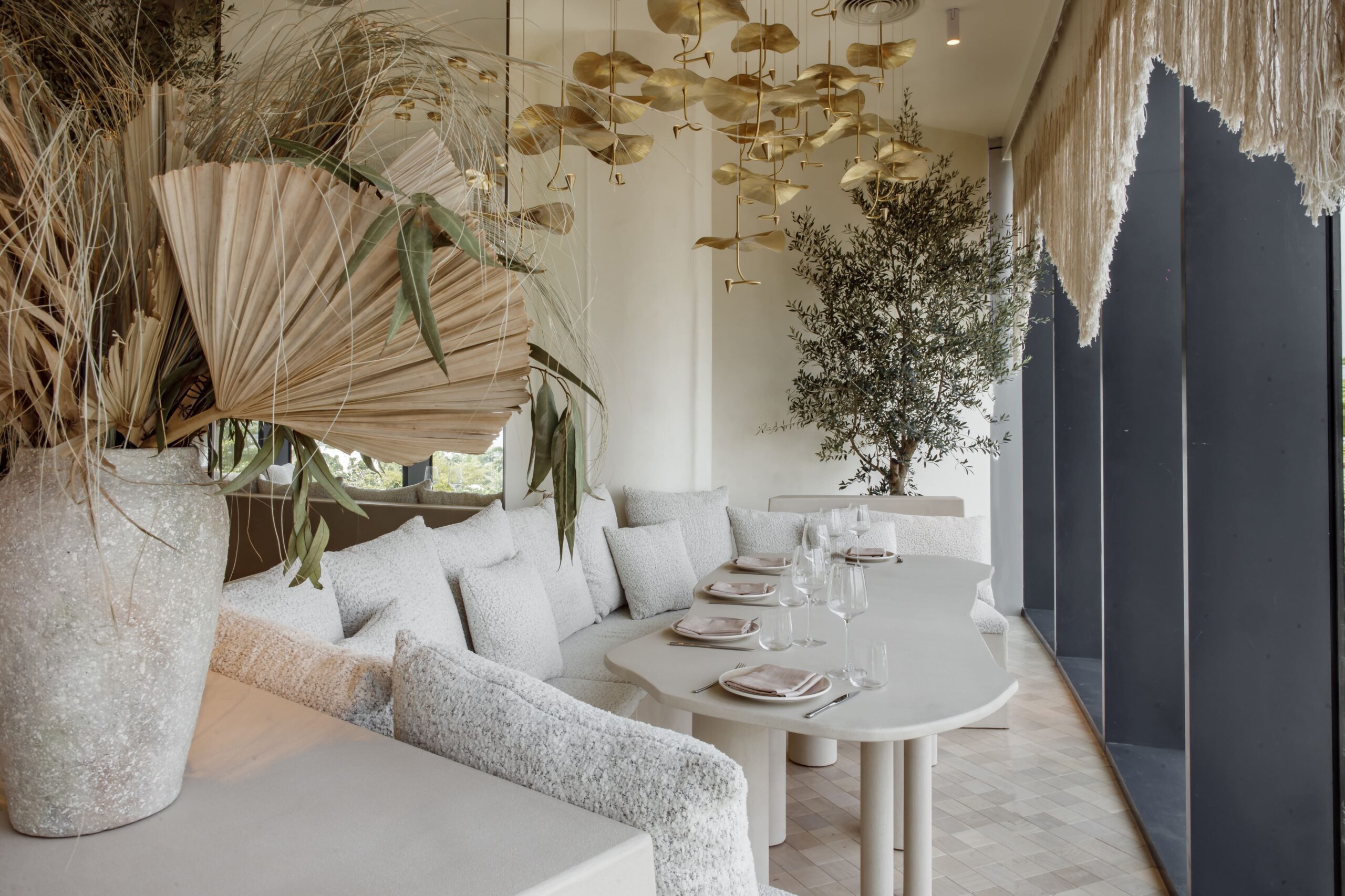The final result is a refined cultural hub that greets guests with an open-concept kitchen and a warm yet minimalist dining room where sandy colors, an abundance of wood accents, and hand-crafted free-form lights foster a tone that’s relaxed yet upscale.